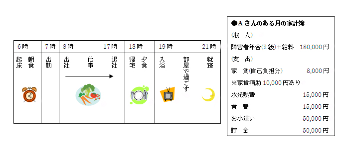 ■グループホームの生活 Aさん(知的障害)の場合 Aさんは、週5日、路線バスを使い、勤務先の会社に行きます。毎朝6時に自分で起床し、6時30分に世話人の準備してもらった朝食を食べ、7時にホームを出て職場へ向かいます。18時にホームに帰宅。その後は、世話人の準備した夕食をホームの仲間と一緒に食べます。自炊も将来的にアパートで1人暮らしをするために出来るようになりたいと思っていますが、今は仕事に通うことを優先して食事は世話人に作ってもらっています。食後はお風呂に入り、その後、部屋でテレビを見たり音楽を聴いたりしながら就寝時間まで過ごします。仕事がお休みの日には、レトルト食品やインスタント食品など簡単な調理はしています。また、お休みの日には、映画に出かけたり、買い物に出かけたりして過ごしています。 |